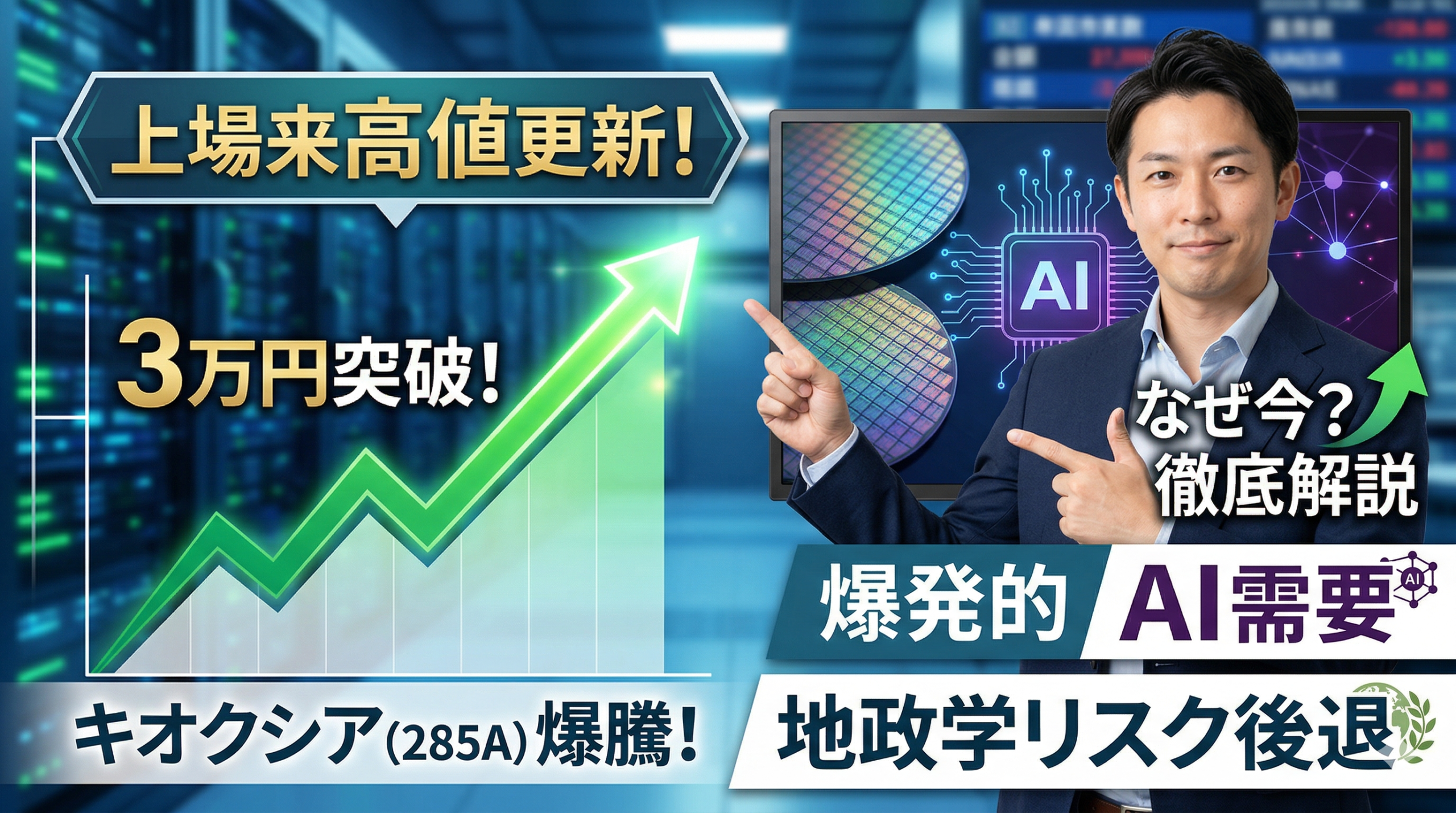 2026年4月10日の東京株式市場で、キオクシアホールディングス(285A)の株価が歴史的な節目を迎えました。前日比で 2,450円(8.84%)高の 30,150円まで買われ、上場以来初めて 3万円の大台に乗せるとともに、連日で上場来高値を更新しています。 なぜ今、キオクシア株にこれほどの買いが集中しているのでしょうか。本記事では、AI需要の爆発的増加や地政学リスクの緩和など、複数の要因が重なった「パーフェクト・ストーム」の背景を専門的視点から分かりやすく解説します。 忙しい方向け:今回の急騰ポイントま ...