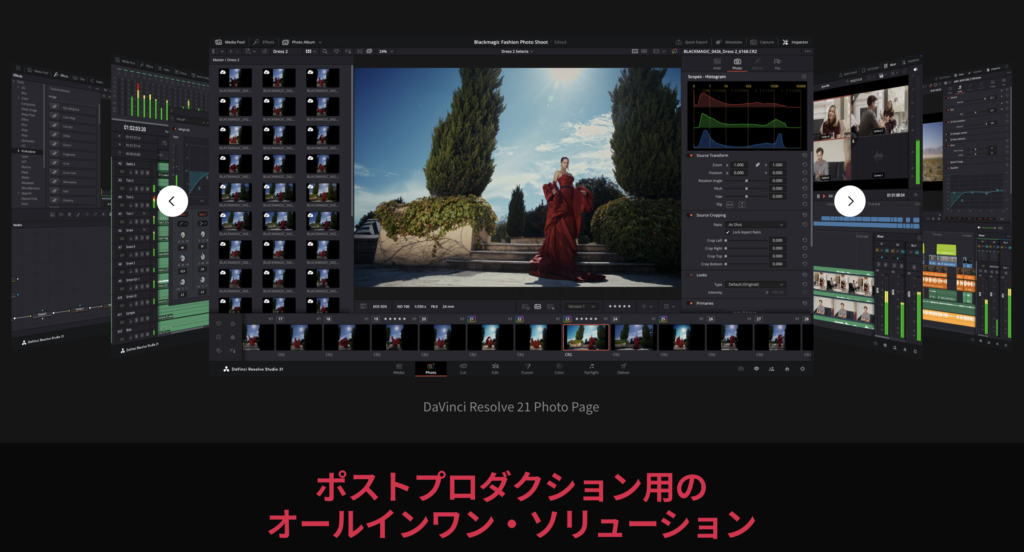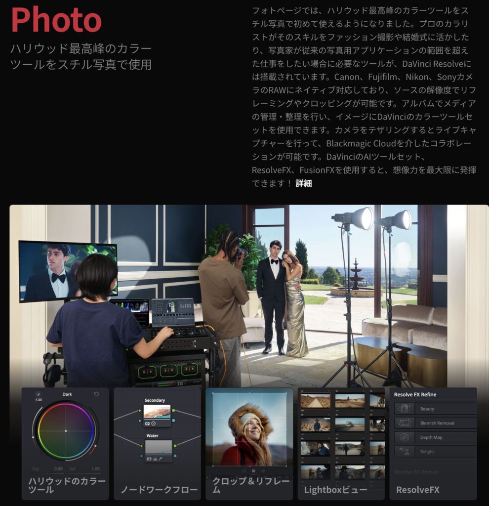 ( フォトページ ) は、DaVinci Resolve内に新設された写真編集専用のページです。RAWデータの現像から管理、レタッチまでを一貫して行うことができます。